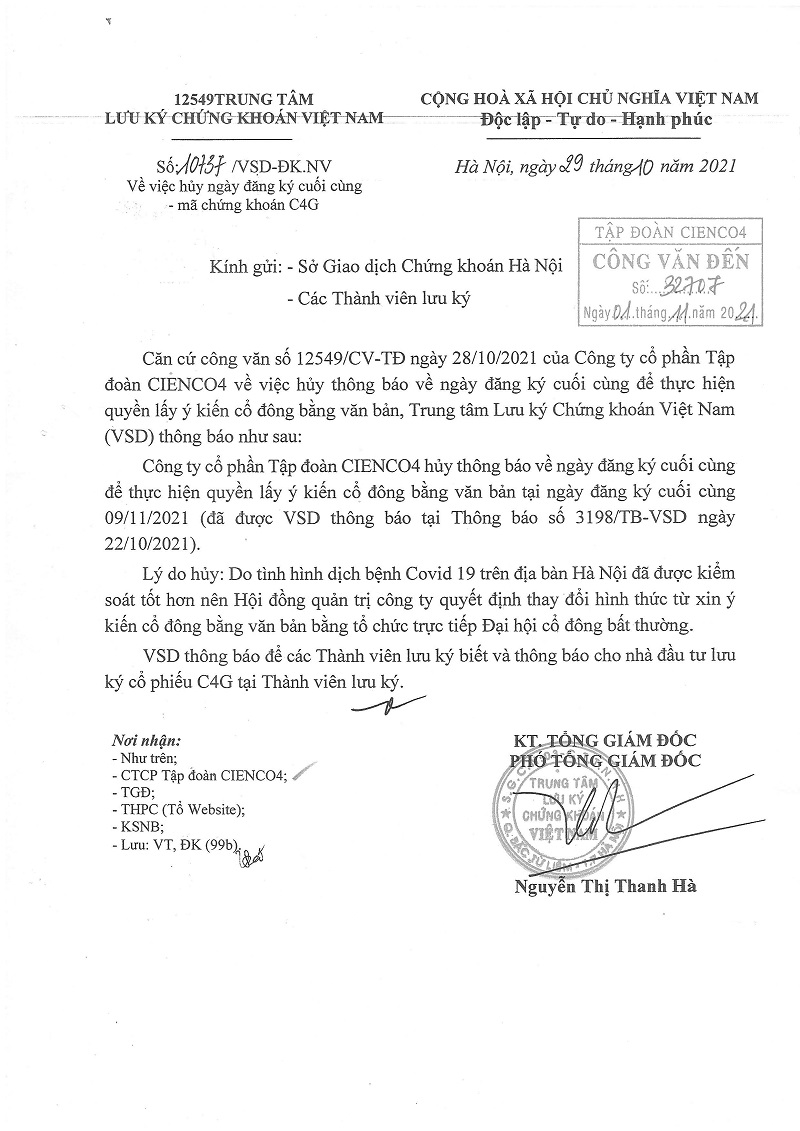 Công bố thông tin, Quan hệ cổ đông CBTT Hủy ngày đăng ký cuối cùng – Mã chứng khoán C4G. Posted on 1 Tháng Mười Một, 2021 by admin CBTT v/v triến khai xây dựng giai đoạn 1 Dự án Khu du lịch, dịch vụ hỗn hợp và nghỉ dưỡng cầu Cau (Nghệ An) CBTT Thông báo về ngày đăng ký cuối cùng và xác nhận danh sách người sở hữu chứng khoán